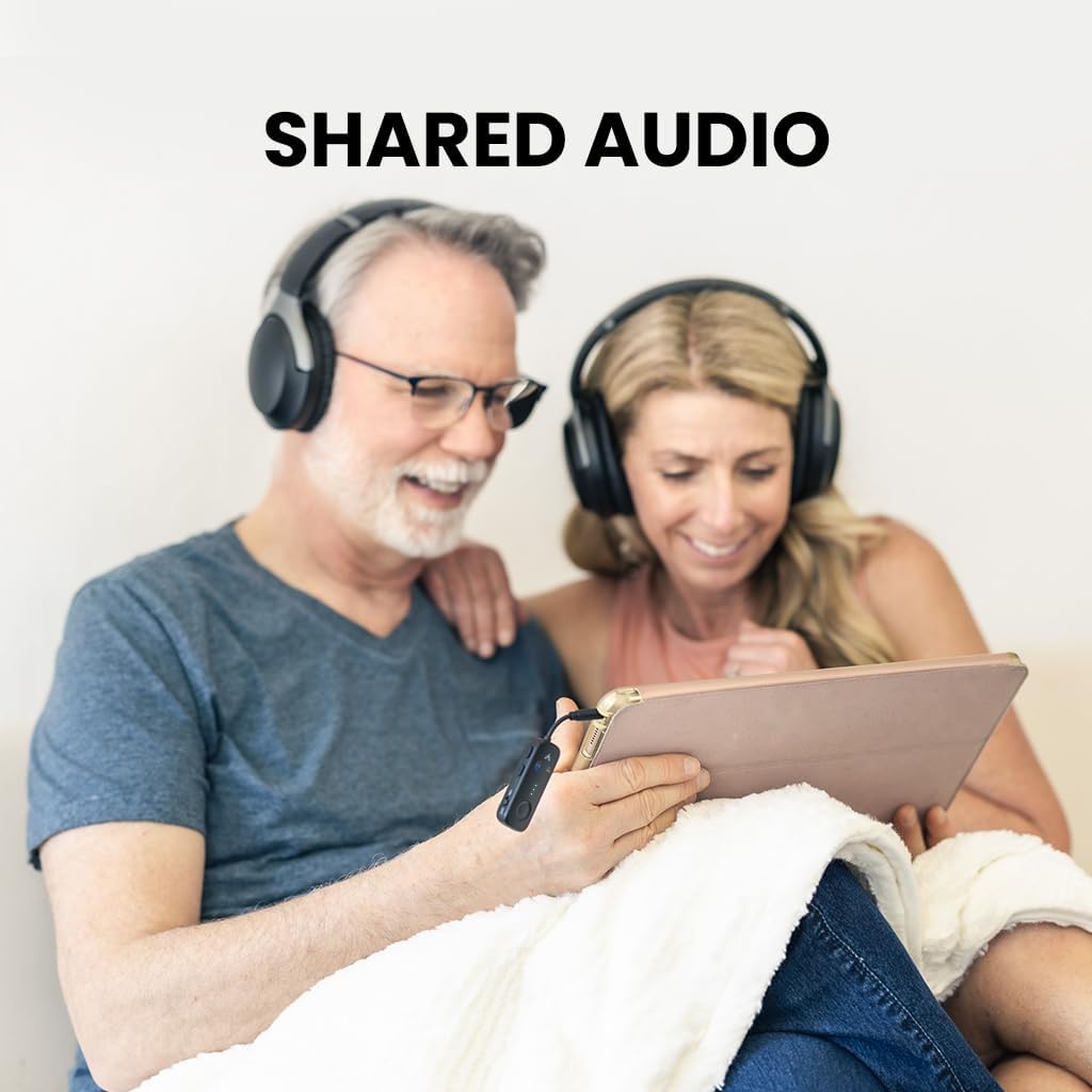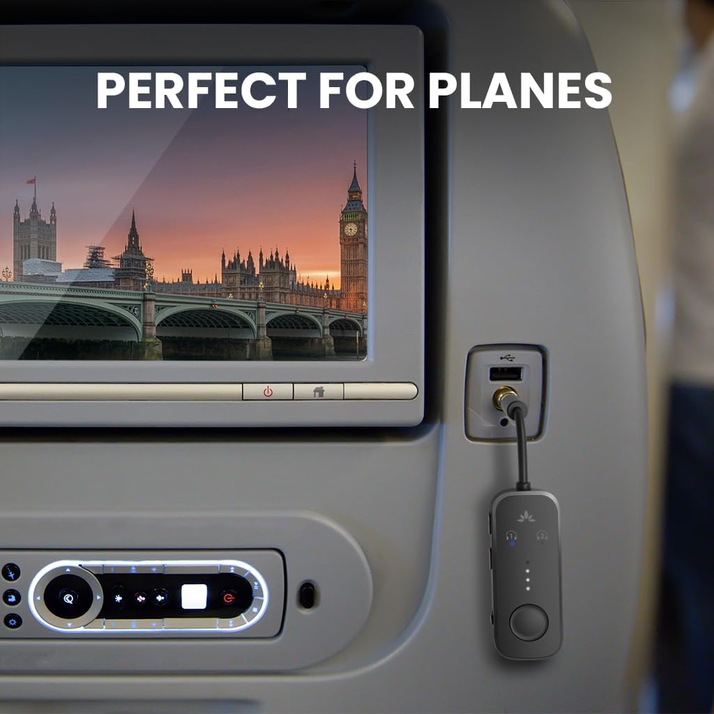 [WIDE COMPATIBILITY] The Relay works with any device that outputs audio via AUX (i.e. planes, TVs, gym equipment, etc.) and can connect to any and all Bluetooth headphones or earbuds (i.e. AirPods Pro 2). The included dual 3.5mm adapter also makes the Relay usable on any flight, regardless of connector type.