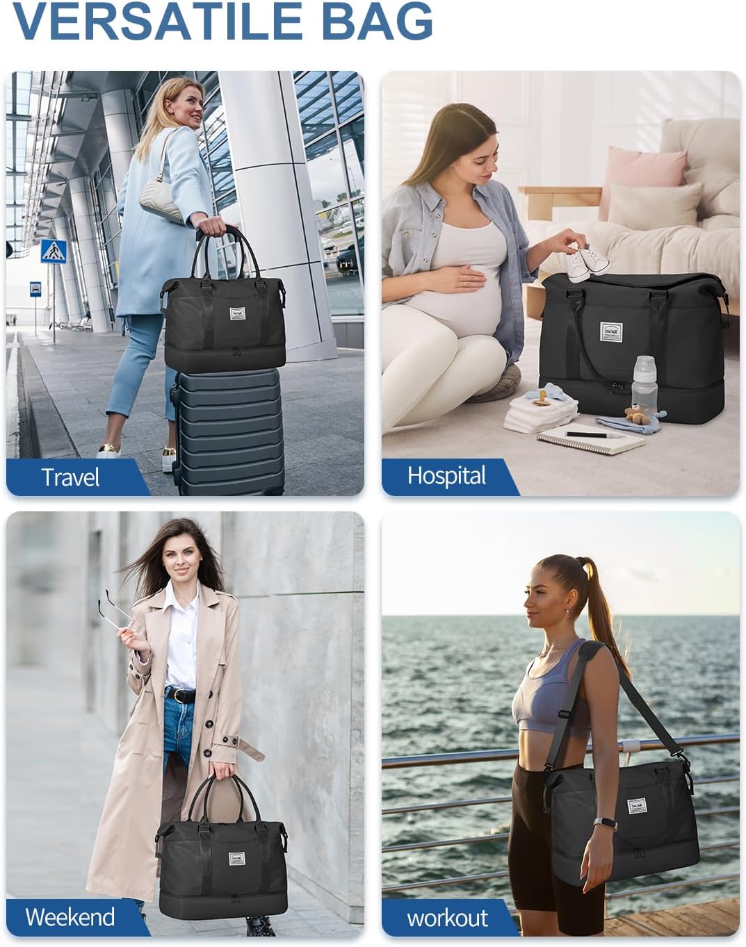 【Versatile Overnight bag】This weekender bag has six multiple internal and two external organizational pockets,which ensure you have a place for everything. With its durable construction, lightweight design, and stylish look, this duffle bag can be used as travel bag, gym bag, workout bag, hospital bag, weekend bag, overnight bag as well as a mom bag.