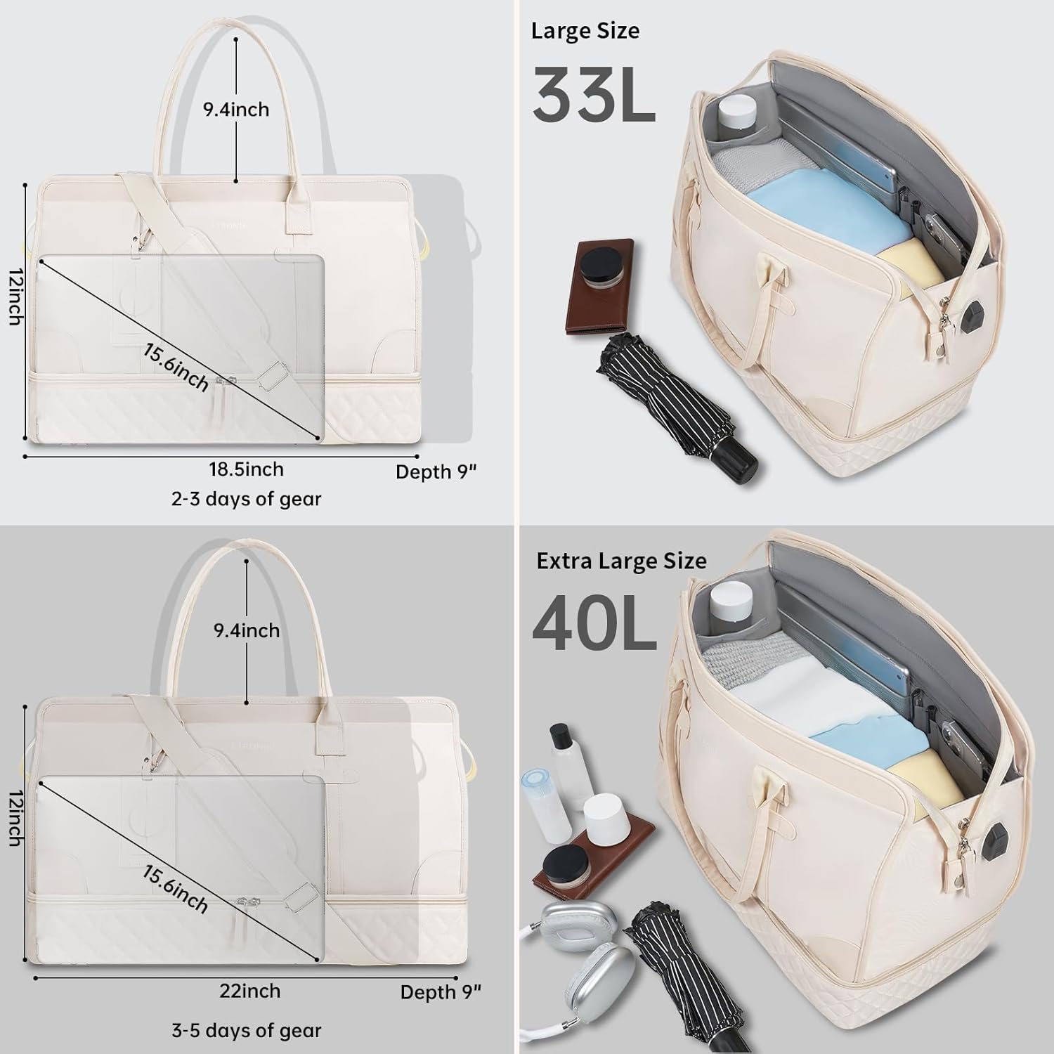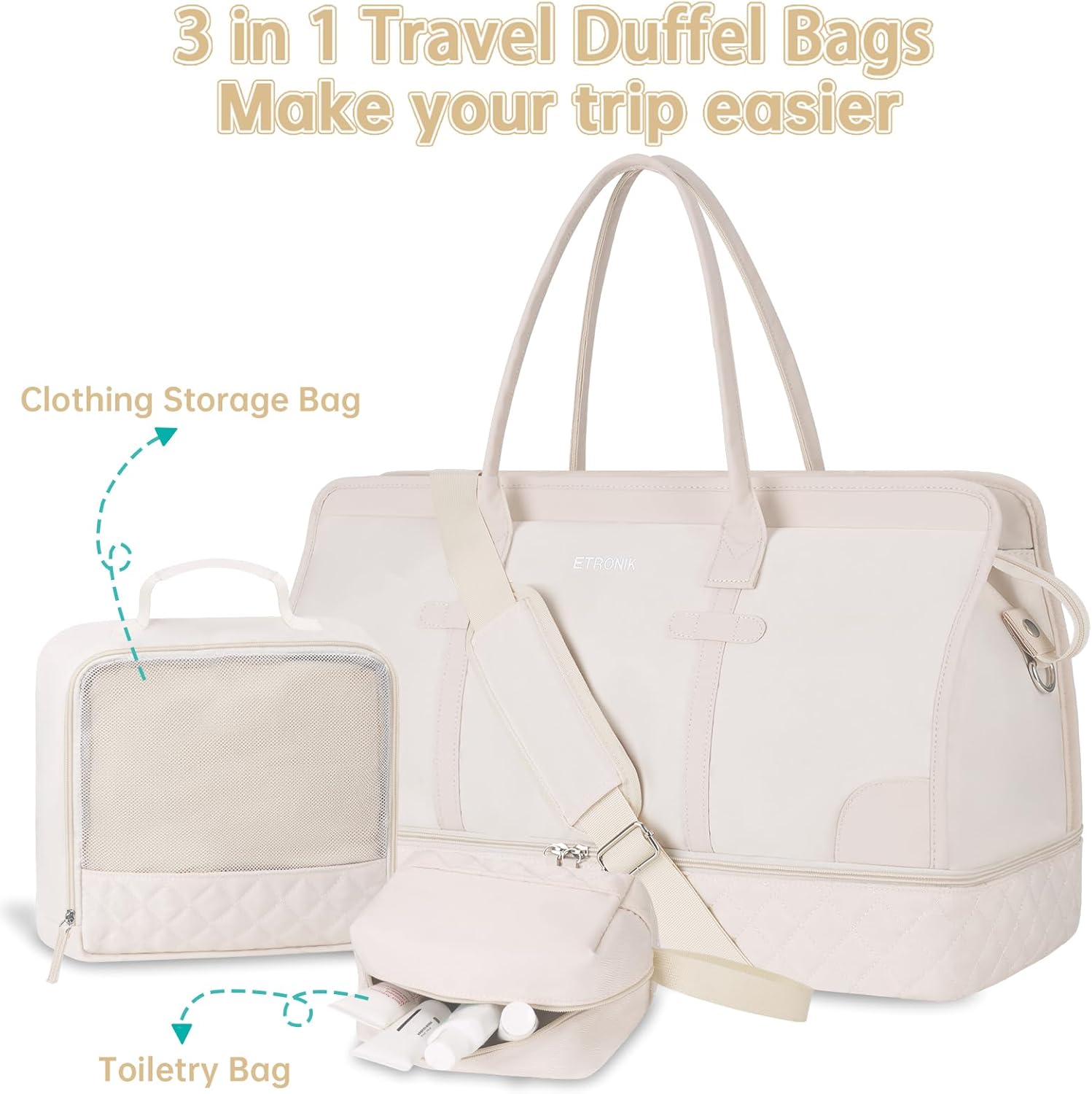 ETRONIK Weekender Overnight Bags for Women, Large Travel Duffle Bags with Shoe Compartment & Wet Pocket, Carry On Tote Bag Gym Duffel Bag with Toiletry Bags for Hospital 3 Pcs Set, Large Size, Beige