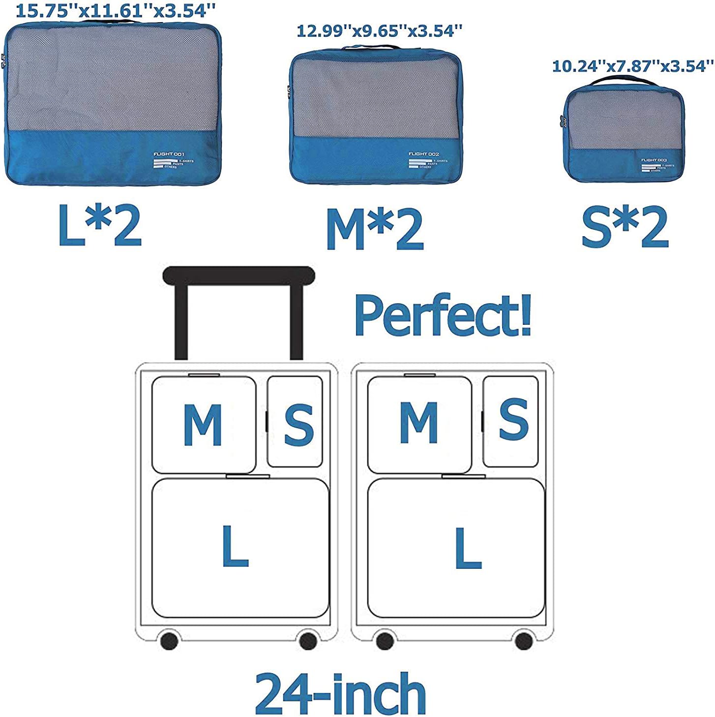 6 Travel Packing Cubes:Large(15.75’’x11.61’’x3.54’’)x2 +Meduim(12.99’’x9.65’’x3.54’’)x2+Small(10.24’’x7.87’’x3.54’’)x2.