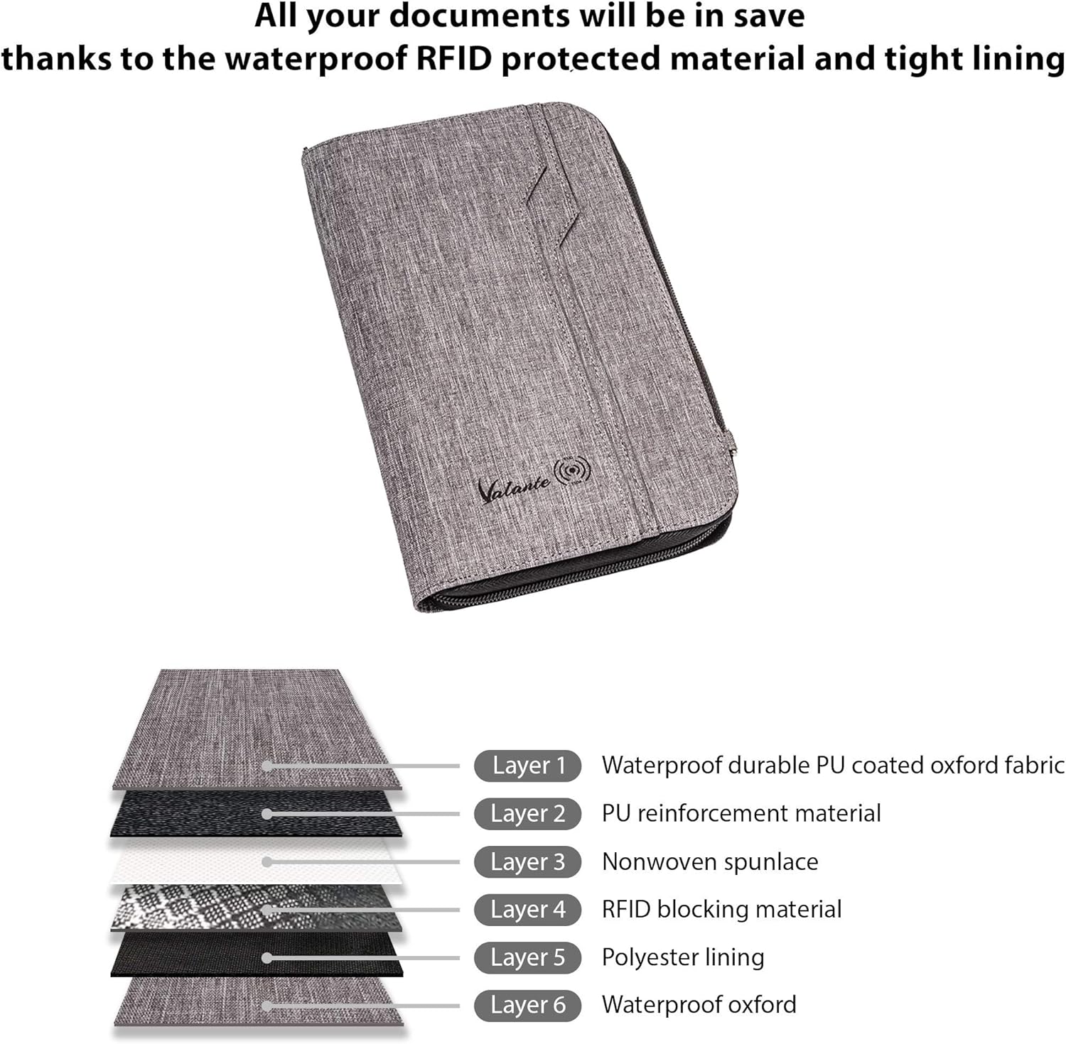 We want to present you thought out to the smallest details IMPROVED RFID protected Valante Travel Document Organizer. It is an indispensable accessory on any trip, especially if you have a large family or you are traveling in a group. Large enough to hold documents for up to 6 people. Travel document organizer holds up to 6 passports, a lot of cash, tickets, 4-8 credit cards, 2 pens, ID cards, driver’s licenses, boarding passes, printed copies of documents, keys, banknotes, coins, any size phone, memory or SIM cards and other essentials…