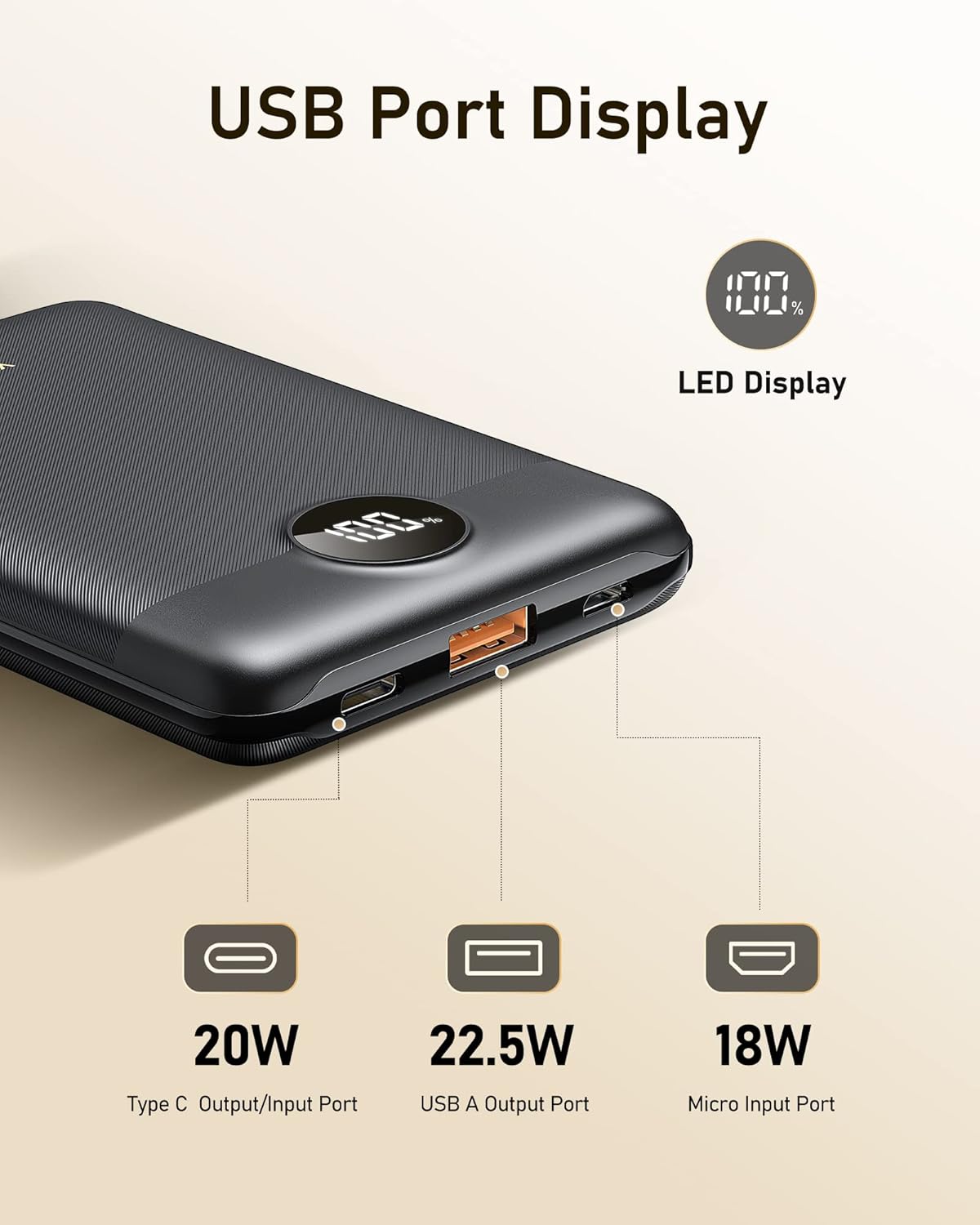 Dual Input & Output USB C: Unique featuring a versatile USB C port supporting both input and output charging, the VEEKTOMX 10,000 mAh portable charger power bank can perfectly fit your iPhone 15, iPads, and all upcoming USB-C devices using just one USB C cable. The smart digital LED battery level indicator keeps you informed of the remaining power and charging status, ensuring you’re always aware of your battery bank’s status at a glance.