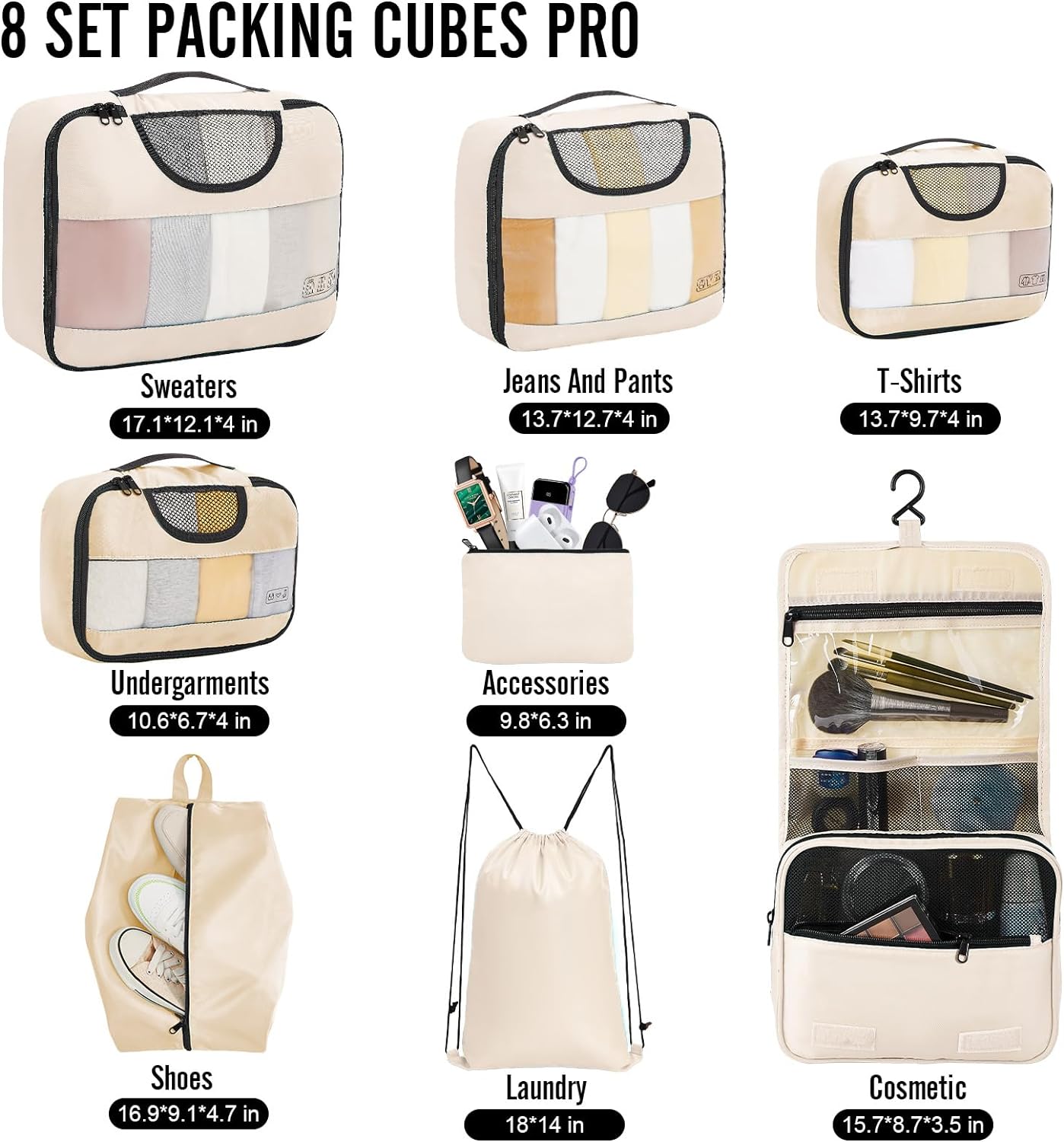 Product Includes: Extra Large Cube ( 17.1″ x 12.1″ x 4″) Large Cube (13.7″ x 12.7″ x 4″) Medium Cube (13.7″ x 9.7″ x 4″) Small Cube (10.6″ x 6.7″ x 4″) Shoe Bag (16.9″ x 9.1″ x 4.7″) Laundry Bag (18″ x 14″) Toiletry Bag (8.7” x 6.7” x 3.5”) Accessories Bag (9.8” x 6.3”)