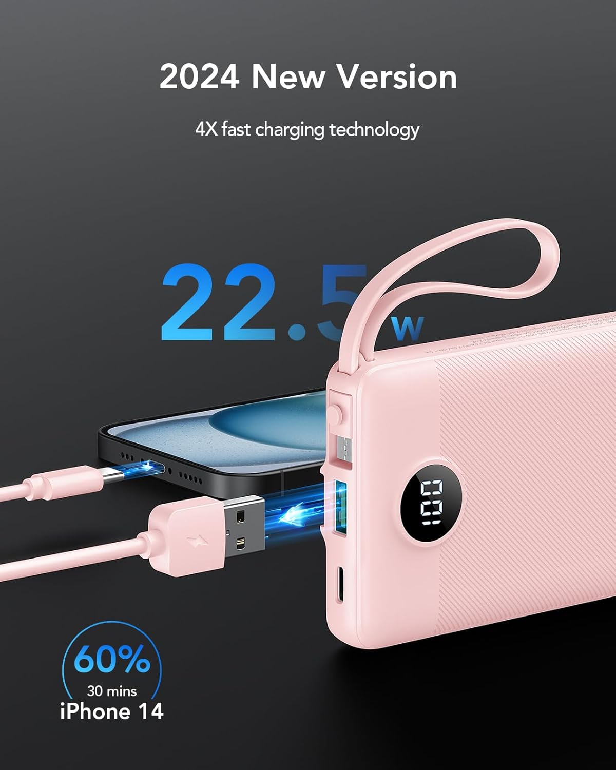 【2024 Newest Portable Charger】 Upgraded 22.5W USB port, 20W USB C input and output cable, 4x fast charging technology. Portable lanyard design, round high-definition LED display, stylish anti-slip shell. Strong and durable cable, well-made with high-quality materials.